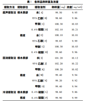 分別稱取黑果小檗根皮、根木質部粉末各 8 份,每 份 5 g,置 50 mL 錐形瓶中,分別取其中 4 份加入 10 倍 量的 0. 4% H2 SO4、95% 乙醇、甲醇、蒸餾水 50 ℃、超聲 提取兩次,每次提取 1 h; 另取 3 份加入 10 倍量的 95% 乙醇、甲醇 80 ℃、蒸餾水回流提取 2 次,每次提取 2 h; 另取一份加入 0. 4% H2 SO4 溶液的樣品冷浸提取 2 次,過濾合并濾液,揮干溶劑,得不同溶劑提取物浸膏, 稱重。精密稱取 100 mg 不同溶劑提取物浸膏,分別置 于 5 mL 容量瓶中,加甲醇溶解、稀釋至刻度,搖勻得一 定濃度的供試品溶液,過 0. 22 μm 濾膜,過濾除雜,貯 于 4 ℃冰箱冷藏,備用。各樣品稱樣量見下表 1。
