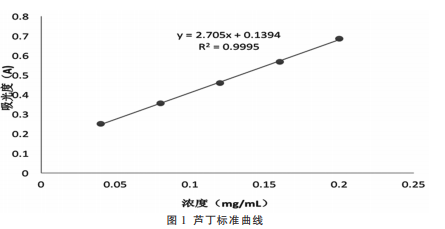 精密稱取 2.0mg 蘆丁標(biāo)準(zhǔn)品置于 10mL 的容量瓶中,加 70%乙 醇,振搖待對照品溶解后,加 70%乙醇定容至刻度,得到濃度為0.2mg/mL 的蘆丁標(biāo)準(zhǔn)品溶液。分別精密移取 2.0、4.0、6.0、8.0、 10.0mL 蘆定標(biāo)準(zhǔn)品溶液,置于 10mL 容量瓶中,依次編號為 1、2、3、 4、5,用 70%乙醇溶液定容至刻度,得到濃度分別為 0.04、0.08、 0.12、0.16 和 0.20mg/mL 的溶液,從每個(gè)容量瓶中各吸取 1.0mL 溶 液置于 10mL 容量瓶中,加入 70%乙醇溶液 3mL 和 5%NaNO2 溶液0.5mL,搖勻,靜置 5 分鐘后,加入 10%A1(NO3 )3 溶液 0.5mL,搖勻,再靜置 5 分鐘后,加入 5%NaOH 溶液 5.0mL,搖勻,靜置 15 分鐘。以不加蘆丁對照品的溶 液為空白試驗(yàn),用紫外 - 可見分光光度計(jì)在 510nm 處測定吸光值(A),設(shè)濃度為標(biāo)準(zhǔn)曲線的橫坐標(biāo),吸 光度為標(biāo)準(zhǔn)曲線的縱坐標(biāo),繪制標(biāo)準(zhǔn)曲線并得到線 性回歸方程。結(jié)果見圖 1。