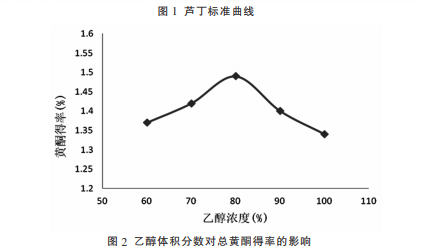 由圖 2 可以看出,隨著乙醇濃度不斷的增加,黃 酮得率呈先升高后下降的趨勢,這說明隨著乙醇濃 度的提高,溶于乙醇中的黃酮類化合物增加,得率隨 之提高,在乙醇濃度達(dá)到 80%時(shí)總黃酮得率最大,隨 后就呈下降趨勢。