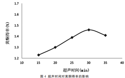 由圖 4 可看出,超聲時(shí)間在 15~30min 之間,隨 提取時(shí)間延長,總黃酮得率呈上升趨勢;當(dāng)超聲時(shí)間 達(dá)到 30min 時(shí),總黃酮得率達(dá)到最大值;超聲時(shí)間大 于 30min 后,總黃酮得率有明顯下降的趨勢,可能隨 時(shí)間延長,熱效應(yīng)逐漸增強(qiáng),溫度升高,導(dǎo)致對熱敏 感的黃酮類物質(zhì)轉(zhuǎn)化降解,提取率降低。因此,最佳 超聲時(shí)間為 30min。