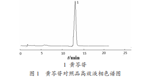 對照品溶液的制備:稱取黃芩苷 對 照 品 適 量 , 精 密 稱 定 , 加 甲 醇 制 成 濃 度 為 0.01857mg/mL 的黃芩苷對照品溶液。供試品溶液的 制備:精密量取本品 5mL,置 100mL 容量瓶中,加 70%乙醇適量超聲處理(250W,40kHz)30min,放冷, 定容至刻度,搖勻,精密量取續(xù)濾液 1mL 置 10mL 量 瓶中,加 70%乙醇至刻度,搖勻,經(jīng) 0.45un 的微孔濾 膜濾過,取續(xù)濾液,即得。