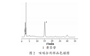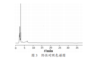 按咳喘合劑處方比例及工藝, 同法制成不含黃芩的陰性樣品,精密吸取黃芩苷對 照品、供試品及陰性樣品溶液各 10μL,按“2.1.1”項 下色譜條件進樣。結果表明陰性樣品溶液無干擾,方 法專屬性良好。見圖 1-3。