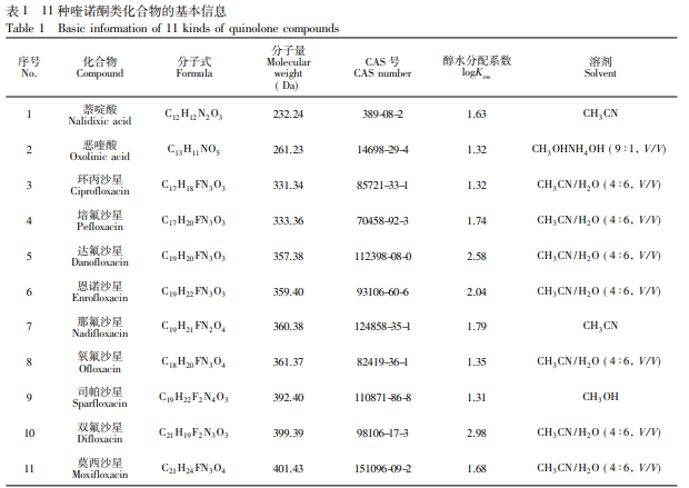 ACQUITY 超高效液相色譜儀( 美國 Waters 公司) ; QTRAP 6500+三重四極桿/復合線性離子阱質譜 儀、Analyst 和 MultiQuant 數據處理系統( 美國 SCIEX 公司) ; Milli-Q Integral 5 型超純水儀( 美國 Merck Millipore 公司) ; AB204-S 型電子天平( 瑞士 Mettler Toledo 公司) ; CR 21N 型高速冷凍離心機( 日本 Hitachi 公司) ; MS3 型渦旋振蕩器( 德國 IKA 公司) ; 昆山舒美KQ-600型超聲波清洗器( 昆山市超聲儀器有限 公司) 。 甲醇、乙腈和四氫呋喃( 色譜純,美國 Fisher 公司) ; 正戊醇、正己醇、正辛醇、正癸醇、正十一醇和正十 二醇( 百靈威科技有限公司) ; 正庚醇和正壬醇( 日本 TCI 公司) 。11 種喹諾酮類化合物標準物質: 萘啶酸 ( 99.5%) 、惡喹酸( 98.0%) 、鹽酸環丙沙星( 95.0%) 、達氟沙星( 97.5%) 、恩諾沙星( 98.0%) 、那氟沙星( 99. 0%) 、司帕沙星( 99.0%) 、鹽酸雙氟沙星( 97.5%) 和鹽酸莫西沙星( 96.1%) 購自德國 Dr. Ehrenstorfer 公司) ; 培氟沙星( 98.0%,加拿大 TRC 公司) ; 氧氟沙星( 98.8%,中國食品藥品檢定研究院) 。11 種喹諾酮類化 合物的基本信息見表 1。