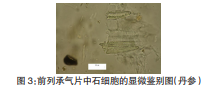 取樣與制片取數片前列承氣片,置研缽中,研碎,再取其粉末適量,用水 合氯醛裝片后透化,觀察載玻片上的組織、結構及其內含物特征。