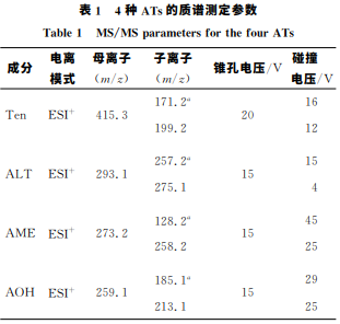 LC條件:ACQUITY UPLCBEH C18 色譜柱(100mm×2.1mm,1.7μm);流動相:體積分數為 0.1%甲酸水溶液∶B 乙腈。梯度洗脫程序:0.0~ 0.50min(體 積 分 數 為 95% 甲 酸 水 溶 液),0.50~ 5.00min (體 積 分 數 為 95% ~5% 甲 酸 水 溶 液), 5.00min (體 積 分 數 為95%甲 酸 水 溶 液);流 速 為 0.4mL/min;柱溫箱為30 ℃;進樣體積為5μL。 MS條件:電 噴 霧 離 子 源(ESI),正 離 子 和 多 反 應監測(MRM)模式,離子源溫度為150 ℃,脫溶劑 氣流速為800L/h,錐孔氣流速為50L/h,氬氣作為 碰撞氣,4種 ATs的監測離子對及錐孔電壓等質譜 參數見表1。