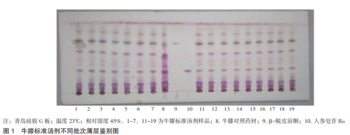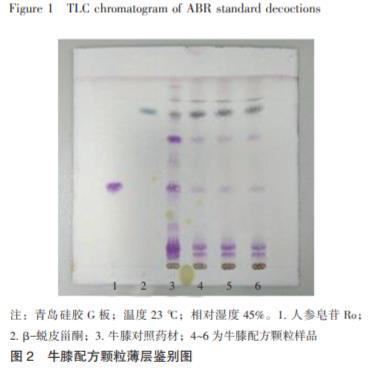 按照《中國藥典》2015 年版四部通則 (0502),吸取供試品溶液、對照藥材溶液和對照品 溶液各 4 μL,分別點于同一硅膠 G 薄層板上;以三 氯甲烷-甲醇-水-甲酸(7∶3∶0.5∶0.05)為展開劑,展 開,取出晾干,噴以 5%香草醛硫酸溶液,在 105 ℃ 加熱至斑點顯色清晰。結果見圖 1、2。以牛膝對照 藥材溶液、β-蛻皮甾酮和人參皂苷 Ro 為參照,牛膝 標準湯劑與配方顆粒樣品溶液在同一硅膠 G 薄層板 相應位置顯相同顏色的熒光斑點。