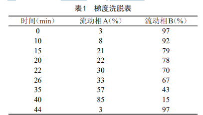 采 用 Waters BEH C18(150mm × 2.1mm,1.7μm)色譜柱;乙腈為流動相 A,0.1%磷酸 溶液為流動相B,按表1的要求進行梯度洗脫;流速 為0.3mL/min,柱溫為40℃;采集波長:241nm。