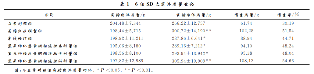 實驗后各組SD大 鼠的體質量均呈現增高趨勢。但是正常對照組、模 型組和黑果枸杞總黃酮粗提物低劑量組 SD 大鼠的 體質量增重率較為顯著,與其余組相比差異具有統 計學意義 (P <0.01),說明黑果枸杞總黃酮粗提物 低劑量組對抑制高脂血癥 SD 大鼠體質量的增長效 果并不明顯。辛伐他汀組、黑果枸杞總黃酮粗提物 高劑量組、中劑量組與其余組相比,對高脂血癥 SD 大鼠體質量的增長率有抑制作用,差異均有統計學 意義 (P <0.05),說明高劑量與中劑量的黑果枸杞 總黃酮粗提物同辛伐他丁都具有減緩高脂飼料對高 脂血癥SD大鼠體質量增長的效果,結果見表1。