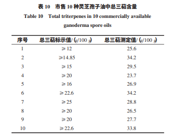 從表 10 中可以看出市售的 10 種靈芝孢子油都能 滿足其標(biāo)示值,其中產(chǎn)品 2 和產(chǎn)品 6 的總?cè)茖崪y值 最高,達到 34.2 %,產(chǎn)品 4 的實測值最低,為 23.7 %。
