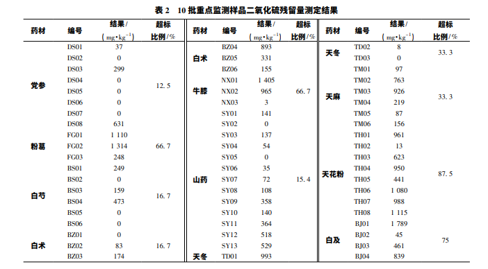 昆山舒美認為法規的生命力在于實施, 法規的權威也在于實施。自 2015 年版 《中國藥典》頒 布實施以來,相關執法部門對過去硫熏嚴重的 10 個品種嚴 格監察,并取得成效。由表 2 可知重點監測的 10 個品 種二氧化硫殘留量主要集中于 0~ 50 mg /kg,限量標準以下 共 38 批,合格率 63. 3%,而 10 個常規品種二氧化硫殘留 量主要集中于 400 ~ 1 000 mg /kg,限量標準以下共 20 批,合格率 32. 8%,且其中 9 個品種的均值都超出限量標準。 即重點監測品種合格率和涉及品種數量均遠低于常規品種。 造成這一現象原因可能在于監管部門對于易超標品種的監 督、檢查、處罰力度遠大于常規品種,違法風險與成本相 對更高,因此重點監測品種硫熏狀況得到有效控制,而常 規品種因監管力度相對較小,硫熏情況更為嚴重。因此, 建議相關質檢部門加強對常規品種的監督和抽查力度,全 面保障中藥材質量安全。