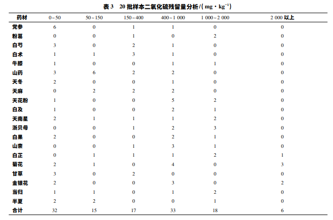 參照 2015 年版 《中國藥典》四部通則 2331 中酸堿滴定法,對 121 批藥材二氧化硫殘留量進行 測定。