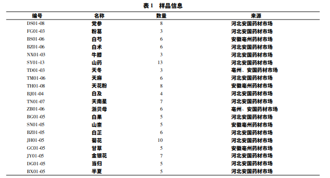 KQ-300VDE 型超聲波清洗儀 ( 昆山超聲儀器公司) ; Quintix224-1CN 電子天平 ( 德國賽多利斯公司) ; IMS-40 雪 花制冰機 ( 常熟雪科電器有限公司) ; FW100 粉碎機 ( 天 津市泰斯特儀器有限公司) 。二氧化硫快檢產品Ⅰ、Ⅱ、 Ⅲ ( 其中Ⅰ和Ⅱ為普適產品,Ⅲ為中藥材專屬快檢產品) 。 鹽酸、雙氧水、氫氧化鈉、甲基紅、無水乙醇等試劑均為 分析純。 從安國、亳州藥材市場收集 20 個品種,每種不低于 3 批,共計 121 批藥材,其中包括《中國藥典》重點考察品 種 10 個 ( 二氧化硫殘留量檢測限度 400 mg /kg) 。樣品信 息見表 1。