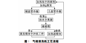 氣相清洗機是以沸騰的溶劑清洗組裝完成的電路 板,達到工件高清潔度的要求,并回收蒸發成氣態的溶 劑,冷凝后完成循環利用和減小對環境污染的要求,其 工藝流程如圖1所示。