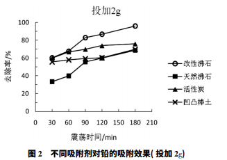 分別取 200 mL Pb2+ 濃度為 0.2 mg /L 的水樣于 8 個 250 mL 錐形瓶內,依次加入 1 g 和 2 g 的天然 沸石、改性沸石、活性炭和凹凸棒土,按步驟 2.4.2 中所述方法進行分析,吸附效果如圖 1 和圖 2 所示。