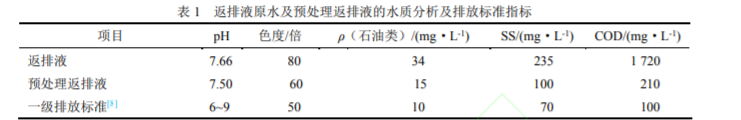 實驗水樣為預處理后的頁巖氣壓裂返排液(預處理返排液)。返排液原水及預處理返排液的水質分析及排放標準指標見表 1。由下圖 可見:由于返排液原水中含大量還原性有機物質,如增粘劑羥丙基胍膠和各種有機物添加劑,其 COD 最高值超過 GB 8978—1996《 污水綜合排放標準》[8]一級排放標準 17 倍、SS指標是國家一級排放標準的 3 倍、ρ(石油類)指標是國家一級排放標準的 3 倍;返排液經絮凝、沉降脫固、過濾等預處理后,出水可滿足重復利用的要求,但各項指標仍無法滿足一級排放標準的要求,COD 為 210mg/L。因此,如何將壓裂返排廢液各項指標特別是 COD 指標降至一級排放標準[8],是壓裂返排液達標排放處理工藝研究的關鍵點。