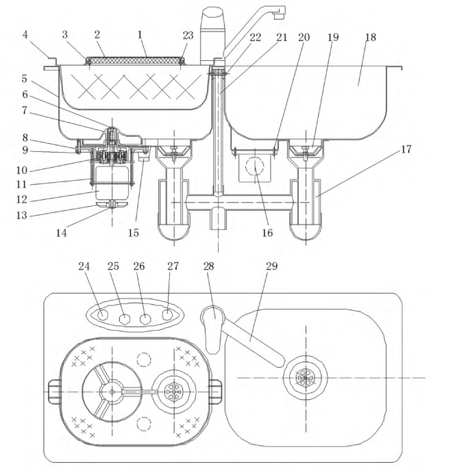 ( 2) 蔬菜和水果洗滌: 洗滌網(wǎng)4放在多功能洗滌槽5上,放置好蔬菜和水果,按程序控制按鍵26,先進(jìn)行超聲波洗滌程序,然后再進(jìn)行波輪洗滌程序,即超聲波洗滌→波輪洗滌→超聲波洗滌→波輪洗滌循環(huán)。對蔬菜和水果洗滌的同時(shí)將蔬菜和水果翻轉(zhuǎn),再用超聲波洗滌,反復(fù)幾次達(dá)到洗凈功能。當(dāng)洗滌網(wǎng)4放置碗筷、盤子、鏟勺等( 也可以將碗筷、盤子、鏟勺等直接放進(jìn)多功能洗滌槽5) ,按超聲波洗滌按鍵27直接進(jìn)行超聲波洗滌程序。洗滌結(jié)束后,打開排水閥19,水通過水槽下水總成17排到下水道。
