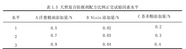 將洋蔥精油以 0.10%、0.30%、0.50%、0.70%、0.90%的比例,乳酸鏈球菌素以 0.01%、 0.02%、0.03%、0.04%、0.05%的比例,茶多酚以 0.05%、0.10 %、0.20%、0.30%、0.40%的 比例分別添加到處理后的低溫雞肉中,進行了單因素試驗,其它配方添加質量和加工工藝不 變,以低溫雞肉細菌總數為評價指標,篩選出天然復合防腐劑的最佳添加比例分別為洋蔥精 油 0.70%,Nisin0.03%,茶多酚 0.30%。 通過正交試驗,可知三個因素對樣品細菌總數影響的主次順序為:洋蔥精油>茶多酚> 乳酸鏈球菌素;最優的因素水平組合為 A?B?C1,即天然復合防腐劑三種成分比例的最佳組合 為洋蔥精油添加 0.70%、乳酸鏈球菌素添加 0.03%、茶多酚添加 0.20%。低溫雞肉樣品細菌 總數在經過最優水平組合比例處理后為 85 cfu/g。 試驗證明復合防腐劑可有效延長低溫肉制品的保藏期,給低溫肉制品的保藏提供了可行 的辦法,為低溫肉制品發展奠定基礎。