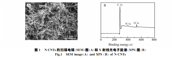 圖1A 為制備的 N-CNTs的掃描電鏡(SEM)圖,從圖中可以明顯看出該納米材料呈現(xiàn)管狀結(jié)構(gòu),且有 明顯的竹節(jié)狀。進(jìn)一步利用 X射線光電子能譜(XPS)對(duì)其表面組分進(jìn)行了表征,圖1B為制備得到的納 米結(jié)構(gòu)的 XPS圖,在284.6、399.8和532.7eV 處的峰分別對(duì)應(yīng)于C1s、N1s和 O1s的峰,表明已成功制 備了 N-CNTs。