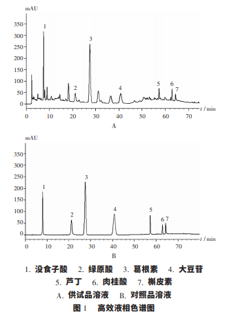 稱取葛根素對照品 30 mg,精密稱定,置 10 mL 容 量瓶,用甲醇定容至刻度,搖勻,得對照品溶液。分別稱 取大豆苷、沒食子酸、綠原酸、肉桂酸、蘆丁、槲皮素對照 品( 17,7,21,12,21,18 mg) ,用甲醇定容于 25 mL 容量 瓶中,作為對照品貯備液。稱取同一批樣品( 批號為 S2) 內(nèi)容物 0. 5 g,精密稱 定,加入約 50 mL 50% 乙醇回流 1. 5 h,過濾,殘?jiān)屑?入 50 mL 50% 乙醇繼續(xù)回流 1. 5 h,重復(fù) 2 次,合并 3 次 濾液,減壓濃縮至約 15 mL,加 50% 乙醇定容至 25 mL, 搖勻,濾過,取續(xù)濾液,即得供試品溶液。