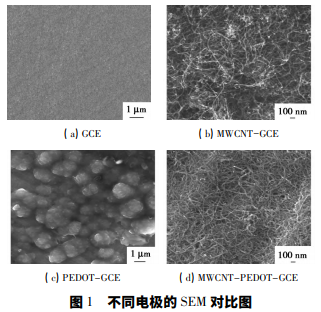 用混酸處理多壁碳納米管,過(guò)濾,洗滌至中性; 分散劑采用 N,N-二甲基甲酰胺,超聲 30 min,得到 質(zhì)量濃度為 1 mg /mL 的碳納米管懸濁液。3 mm 的 玻碳電極( GCE) 依次用 0. 3、0. 05 μm 的 Al2O3 拋 光,然后分別在蒸餾水、乙醇、蒸餾水中超聲 2 min。 電沉 積 PEDOT,沉 積 液 為 0. 01 mol /L 的 EDOT、 0. 1 mol /L 的 KClO4、0. 02 mol /L 的十二烷基硫酸鈉 溶液,在 0 ~ 1. 1 V 下,循環(huán)伏安掃描 5 圈,掃速為 50 mV / s。