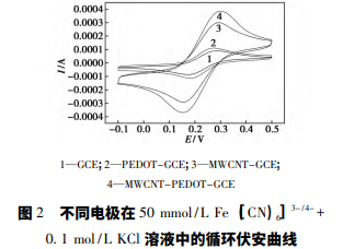 從圖 1 中可以看出,GCE 的表面光滑平整,表 明 GCE 表面已經(jīng)被打磨干凈,沒(méi)有吸附任何物質(zhì); 而 PEDOT - GCE 的表面凹凸不平,有 凸 起,這 是 PEDOT 已成功沉積于電極表面; MWCNT-PEDOT- GCE 表面只能看到管狀堆積結(jié)構(gòu),表 明 懸 涂 的 MWCNT 將 PEDOT 已完全覆蓋。PEDOT-GCE 的凹 凸表面以及碳納米管的堆積結(jié)構(gòu)都能夠有效增大電 極的表面積,有利于被測(cè)物質(zhì)的吸附。不同 電 極 在 50 mmol /L Fe [( CN) 6]3- / 4- + 0. 1 mol /L KCl 溶液中的循環(huán)伏安曲線如圖 2 所示。從圖 2 中可以看出,各修飾電極的峰電流均增 大,PEDOT 電極略有增大,其中含有碳納米管的2 種修飾電極峰電流最大,表明碳納米管能夠明顯 增強(qiáng)電化學(xué)活性和電化學(xué)反應(yīng)有效面積,其 中 PEDOT 與多壁碳納米管兩者能夠起到協(xié)同作用。