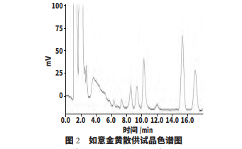 取如意金黃散約 1g,精 密稱定,加入甲醇 50mL,稱重,室溫下超聲處理 30min,取出放冷,甲醇補足至原質量,過濾,棄去初 濾液,剩余濾液再經 0.45μm 微孔濾膜濾過,制得供 試品溶液備用。