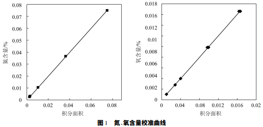由于因瓦合金正處于研發(fā)階段,其標(biāo)準(zhǔn)樣品在 市場中少有發(fā)現(xiàn),因此使用元素含量相近鋼的氧氮 氣體標(biāo)準(zhǔn)樣品來繪制校準(zhǔn)曲線。標(biāo)準(zhǔn)樣品具體信息 見表 1。根據(jù)表 1 中數(shù)據(jù),繪制氮含量、氧含量的校準(zhǔn)曲 線,結(jié)果如圖 1 所示。當(dāng)?shù)臏y定范圍為 0. 002 6% ~ 0. 075 1% 時,其含量線性方程為 y = 1. 001x - 0. 000 02,R2 = 1 > 0. 99,線性較好,可以使用; 當(dāng)氧的測定范圍為 0. 001 1% ~ 0. 016 6% 時,其含量線 性方程為 y = 1. 007x - 0. 000 05,R2 = 0. 999 > 0. 99, 線性較好,亦可使用。