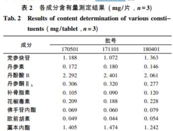 取含有量已知的片劑6份,除去糖衣后研成細粉,混勻,精密稱取約 1. 0 g,置 于 25 mL 具 塞 錐 形 瓶 中,精 密 加 入 0. 931 mg /mL 黨參炔苷對照品溶液 4. 0 mL、 0. 541 mg /mL 丹參素對照品溶液 1. 0 mL、 1. 431 mg /mL 丹 酚 酸 B 對 照 品 溶 液 5. 0 mL、 0. 962 mg /mL 丹 參 酮 ⅡA 對 照 品 溶 液 1. 0 mL、 0. 329 mg /mL 補骨脂素對照品溶液 1. 0 mL、 0. 648 mg /mL 花椒毒素對照品溶液 1. 0 mL、 0. 216 mg /mL 佛手苷內酯對照品溶液 1. 0 mL、 0. 155 mg /mL 歐前胡素對照品溶液 1. 0 mL、 0. 877 mg /mL藁 本 內 酯 對 照 品 溶 液 5. 0 mL,按 “2. 3”項下方法制備供試品溶液,在 “2. 1”項色 譜條件下進樣測定,計算回收率。結果,黨參炔 苷、丹參素、丹酚酸 B、丹參酮ⅡA、補骨脂素、 花椒毒素、佛手苷內酯、歐前胡素、藁本內酯平均 加樣 回 收 率 ( RSD) 分 別 為 98. 33% ( 1. 12%) 、 97. 70% ( 0. 95%) 、100. 23% ( 0. 78%) 、99. 45% ( 1. 40%) 、98. 49% ( 1. 32%) 、98. 79% ( 0. 84%) 、 97. 86% ( 1. 26%) 、 96. 97% ( 1. 59%) 、 99. 12% ( 0. 87%) 。 2. 7 樣品含有量測定 取 3 批片劑,按 “2. 3” 項下方法制備供試品溶液,在 “2. 1”項色譜條件 下進樣測定,計算含有量,結果見表 2。