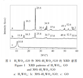 圖 1 為 H2WO4、30%-H2WO4 /GO 和 GO 的 XRD 譜圖。圖 1 中 GO 在 10. 8°處有一個明顯的 峰,對應于 GO 的( 001) 晶面。H2WO4 樣品的衍 射峰強度很高,表明樣品具有較好的結晶度。復合 后 30%-H2WO4 /GO 催化劑出現原 GO 在 10. 8°的 特征峰,但峰型不明顯并向右平移到 11.8°,這說明H2WO4 可能進入到氧化石墨烯的層狀結構中。 30%-H2WO4 /GO 在 10°-60°保持了 H2WO4 的多個 衍射峰,相比于純 H2WO4 的衍射峰,30%-H2WO4 / GO 的峰強度有所下降,峰位置沒有發生位移,說明 H2WO4 均勻分布在 GO 上導致其衍射峰變弱。