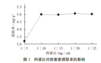 料液比對甜蜜素提取率的影響見圖 3。 由圖 3 可知,對比料液比 1∶5 與 1∶10,前者 的甜蜜素提取率遠低于后者,料液比在 1∶10 后,甜 蜜素提取率幾乎沒有變化。可以判斷料液比 1∶10 可 溶解檳榔中大部分甜蜜素,所以繼續增大料液比對甜蜜素含量幾乎沒有變化。因此,綜合考慮選用料液比 1∶10,1∶15,1∶20 3 個水平進行正交試驗。
