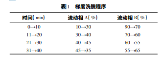 Agilent Zorbax Eclipse XDB - C18色 譜柱( 4. 6 mm × 250 mm,5 μm) ; 混合流動相: 乙腈 為流動相 A,0. 5% 醋酸溶液( 以三 乙 胺 調 pH 至 6. 0) 為流動相 B,梯度洗脫,洗脫順序見表 1; 流速: 1. 0 mL·min - 1 ; 柱溫: 25℃ ; 進樣量: 10 μL; 檢測波 長: 215 nm。