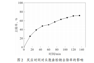 取模擬頭孢曲松鈉廢液 50 mL、過硫酸鈉 50 mL 至 250 mL 錐形瓶中,置于水浴恒溫振蕩器中。 分別在 10、20、30、60、90、120 min 取樣。取樣 測定,計算頭孢曲松鈉廢水的去除率。結果如圖 2 所示。