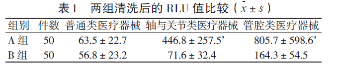 2.1 兩組清洗后RLU值比較A組軸與關節類醫療器械及管腔類醫療器械的RLU值低于B組,差異有統計學意義(P<0.05);兩組普通類醫療器械的RLU值比較,差異無統計學意義(P>0.05)。見表1。
